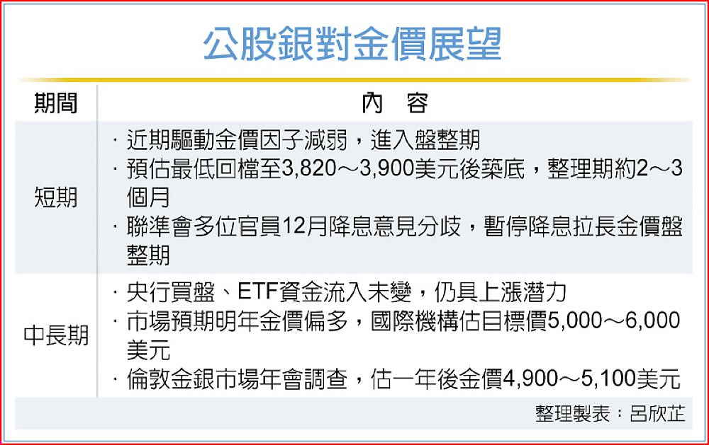 金價自歷史新高回檔後,臺灣銀行貴金屬部經理楊天立預估,金價最低可能進一步回檔至每盎司3,820~3,900美元後築底,整理期約需2~3個月,待美國降息節奏明朗與季節性需求回升後,黃金可望再度展開反彈。