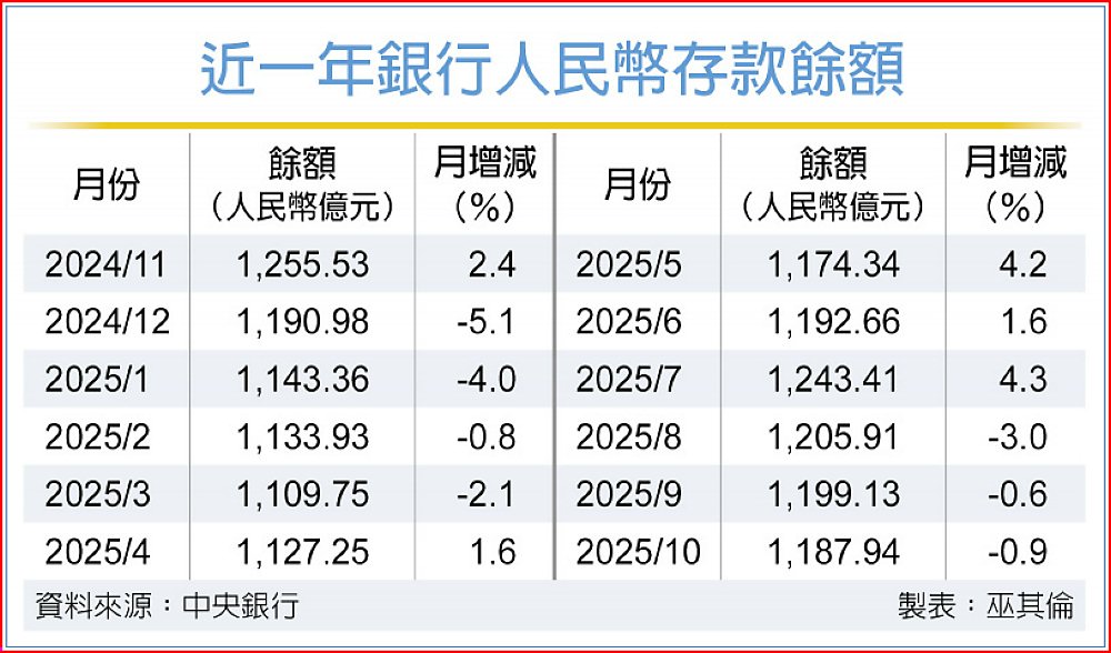 央行官員表示,人民幣存款餘額先前一度回升,8月、9月、10月雖連續三個月下滑,但人民幣仍有實質需求,1,200億元上下應算是基本盤,不至於跌破千億元大關;但整體而言,目前美元利率仍是相對具市場吸引力,後續美元是否持續吸金,就看美國降息速度而定。