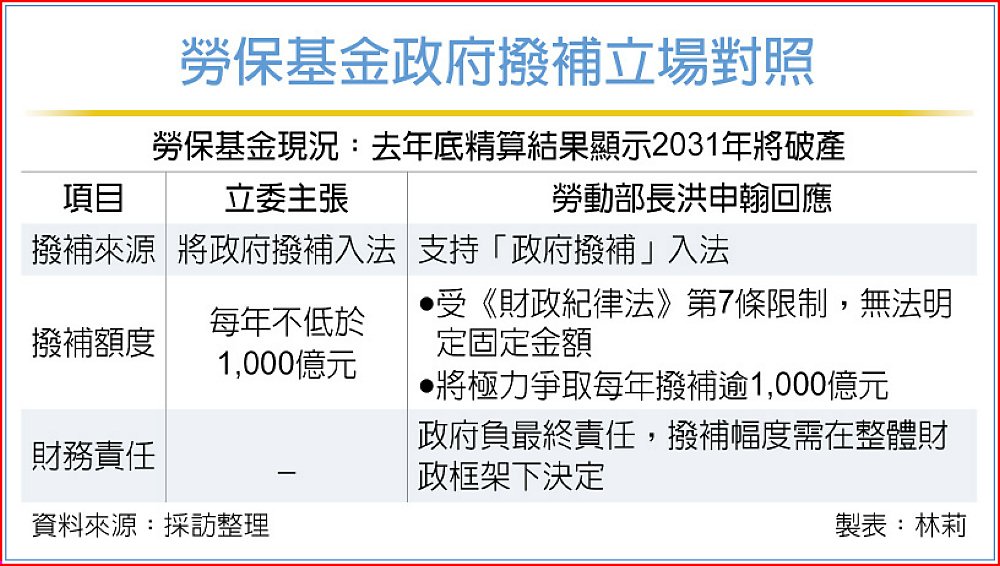 最新精算結果顯示勞保基金將在2031年破產。朝野立委主張應將政府撥補入法,並明訂每年補注金額不得少於1,000億元。勞動部長洪申翰17日表示,政府會對勞保負最終責任,他也支持將「政府撥補」成勞保基金來源入法,惟礙於《財政紀律法》第7條無法明定金額,但未來將極力爭取每年撥補金額逾1,000億元。