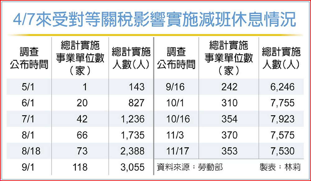 勞動部17日公布最新減班休息(即無薪假)統計,事業單位共計435家通報,實施人數8,456人,相較上期這次減少20家事業單位,惟人數微增125人,仍以製造業為主,占整體約九成。其中受關稅影響共353家,實施人數7,530人,較上期減少17家,實施人數減少45人。