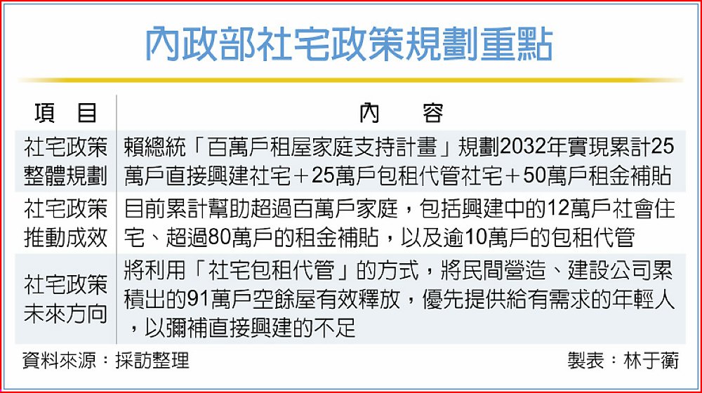 內政部長劉世芳致詞時指出,目前政府的社宅政策累積已幫助超過100萬戶家庭,包括興建中的12萬戶社會住宅、超過80萬戶的租金補貼,以及逾10萬戶的包租代管。儘管中和區已有4處社宅計畫,但因單案興建期長,為加速解決人口稠密地區的居住需求,政府將採取更靈活的策略。未來希望利用「社會住宅包租代管」的方式,將民間營造、建設公司累積出的91萬戶空餘屋有效釋放,優先提供給有需求的年輕人,以彌補直接興建的不足。