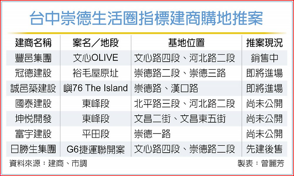 北部建商同樣看好崇德生活圈發展,陸續插旗推案,如冠德建設「裕毛屋原址案」即將登場,預計推出地上24層的住宅產品;國泰建設去年砸10.45億元購得北平路三段約566.58坪的土地,預計改建為住宅大樓。