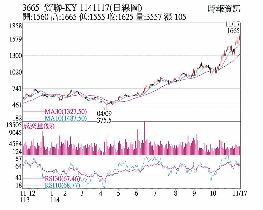 貿聯-KY(3665)被納入MSCI明晟全球標準型指數成分股,市場預期吸引被動買盤湧入,貿聯17日股價再創歷史天價,盤中一度創1,665元新高紀錄,終場漲幅雖收斂,仍勁揚6.9%,以1,625元收市。