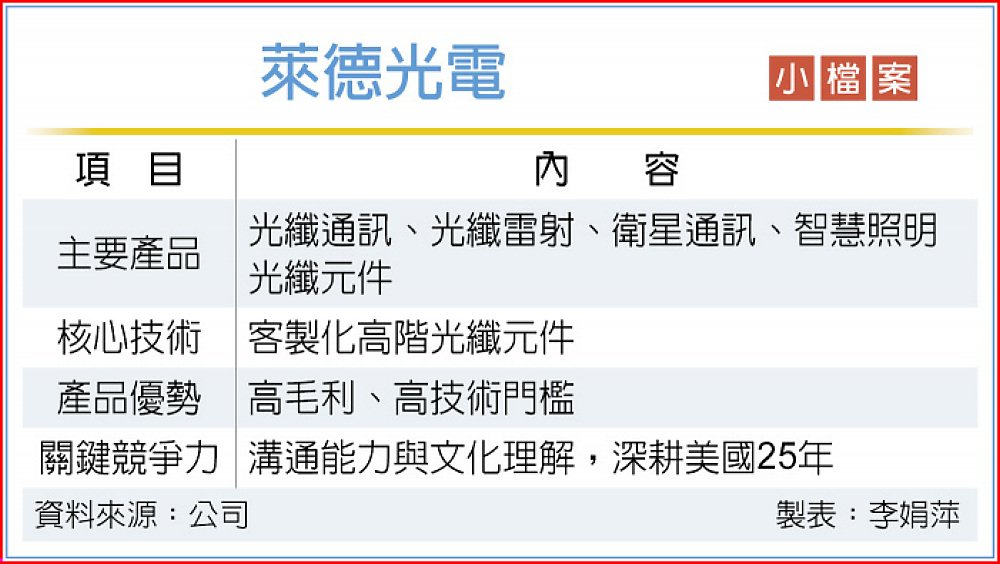 萊德光電執行長沈培生表示,公司長期深耕高階客製化光纖元件,產品涵蓋光纖通訊、光纖雷射、衛星通訊及智慧照明等領域。憑藉自研光纖熔融拉錐設備等關鍵技術,成功切入具有高毛利、高技術門檻的利基市場。