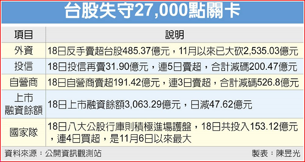 台股受到多項不確定因素升溫影響,18日多頭防線潰敗,「殺融資、多殺多、殺當沖」三殺賣壓湧現。加權指數跳水大跌691點,創下今年第七大跌點,27,000點大關失守,成交值擴增至6,727億元,八大公股券商連四買,單日加碼153.12億元。台股專家認為,利空拉回是不錯的進場點,年底作夢、作帳行情可期。