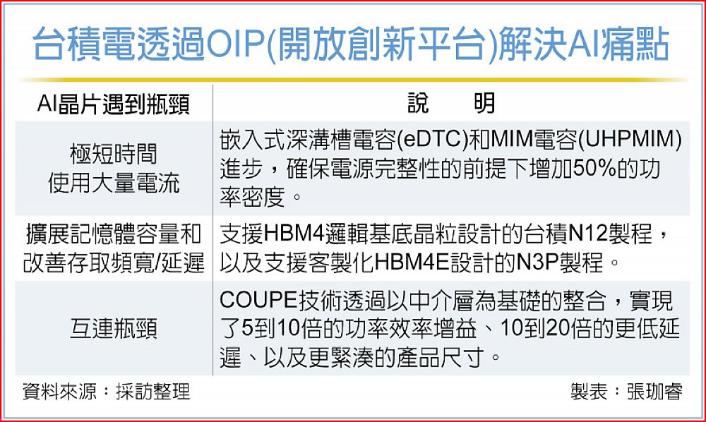 業界分析,台積電今年在OIP論壇上完整展現邏輯製程、先進封裝與設計工具的整合能力,從N2P、A16到A14,再到3DFabric及CPO,三線推進的技術動能,使全球AI供應鏈得以在功耗天花板前找到新突破路徑;同時台灣ASIC業者加入CPO與多晶粒平台合作,更讓台灣整體供應鏈的關鍵性持續提升。