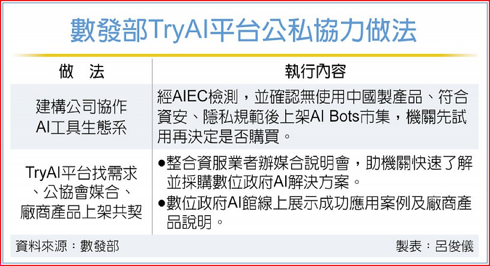 數發部18日宣布3月底上線的「政府AI應用平臺」(TryAI)初步進展。首創「先試用後採購」機制,提供符合政府資安要求的專屬環境,讓機關確認需求後再採購,並藉此助本土廠商AI應用落地。數發部數位政府司司長王誠明表示,預計明年3月至6月間廠商能將AI產品上架到共同供應契約(共契)。
