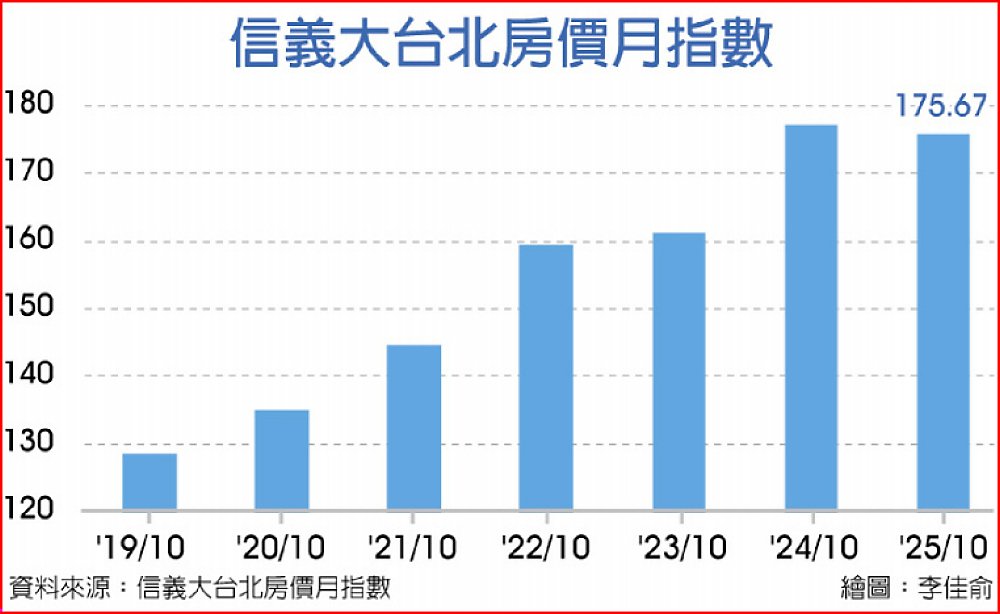 信義大台北房價月指數顯示,台北房價在2020年起明顯起漲,當時房價指數約在130左右,2022年下半年至2023年上半年則出現近一年盤整,2023年下半年漲勢再起,隨著新青安政策點火,2024年12月房價攀升至180.21歷史高點後,在央行信用管制、銀行放款緊縮下,市場買氣急凍,今年以來房價出現盤跌,過去五年來上漲約4成的房價,自高點起算,迄今已有超過2%的修正。