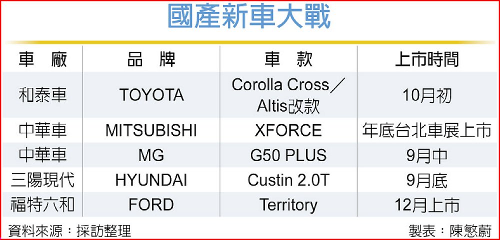 車市回溫,年終車市上演國產新車大戰,除龍頭和泰車推出雙神車改款上陣,南陽現代祭出「月月有新車」,中華車在暌違九年後也啟動三菱國產新車XFORCE預售,福特六和亦加入戰局,18日提前亮相全新國產休旅車Territory,並啟動頂規油電車型預售。