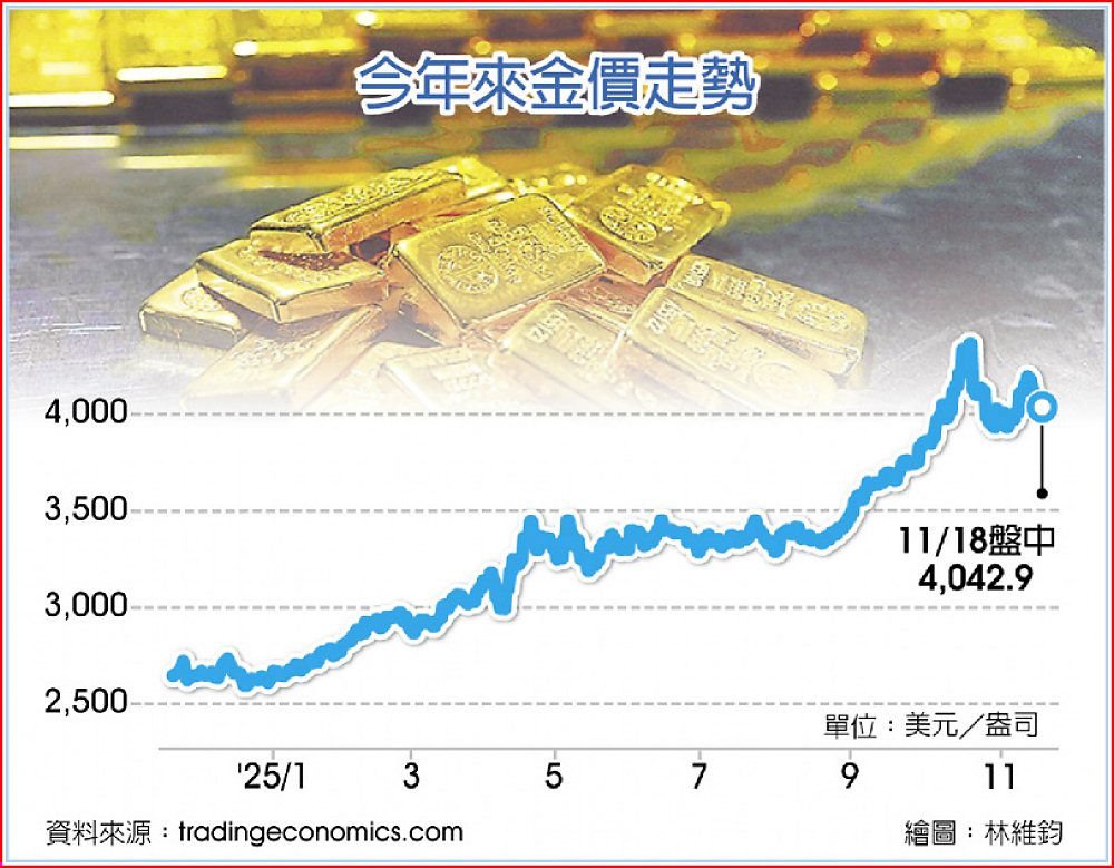 倫敦黃金現貨價18日盤中下跌0.8%報約4,042.9美元,但今年仍累漲約55%。主要是投資人對全球政經局勢憂慮、資金持續流入黃金ETF,以及市場預期美聯準會降息等利多因素推升金價。