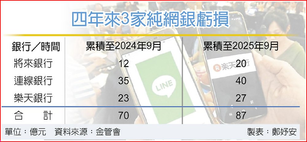金管會公布三家純網銀截至今年9月底的累計虧損金額,將來銀行20億元、LINE Bank 40億元、樂天銀行27億元,合計累虧達87億元;回顧截至去年9月的統計,三家累虧金額為70億元,分別是將來銀行12億元、LINE Bank 35億元、樂天23億元。