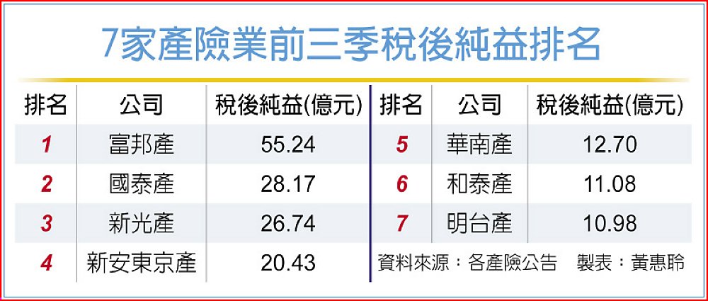 除了前三大產險前三季獲利亮麗外,排名前七名前三季獲利都逾10億元,新安東京海上產20.43億元、華南產12.7億元、和泰產險11.08億元、明台產10.98億元等。