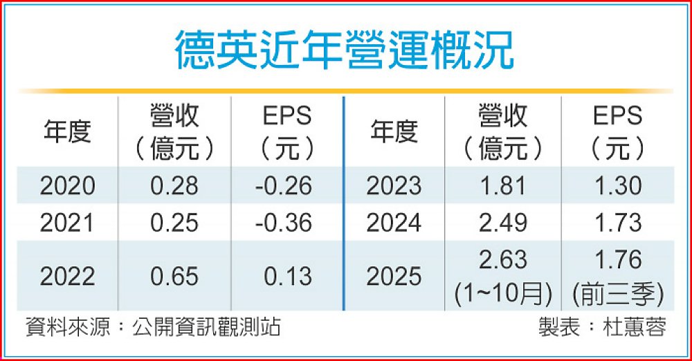 德英近三年業績三級跳,2023年營收1.81億元、稅後純益7,240萬元;2024年營收增至2.49億元、稅後純益1.02億元;2025年前十月營收2.63億元,前三季稅後純益1.11億元,每股稅後純益1.76元,都同步超越2024全年,且創歷史年度新高紀錄。
