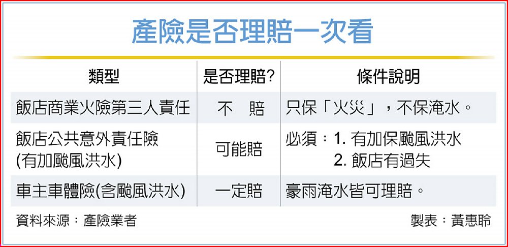 針對車子放地下室被水淹的車險理賠,產險業者解釋,一般飯店投保的「商業火災保險」多會加保「第三人責任附加條款」,但此項保障範圍通常限定為「火災事故所致」,並不涵蓋因豪雨、颱風或淹水造成的車輛受損。若飯店另行投保「公共意外責任險」且特別加保颱風、暴雨、洪水等附加條款,才有可能由產險公司支付相關賠償。