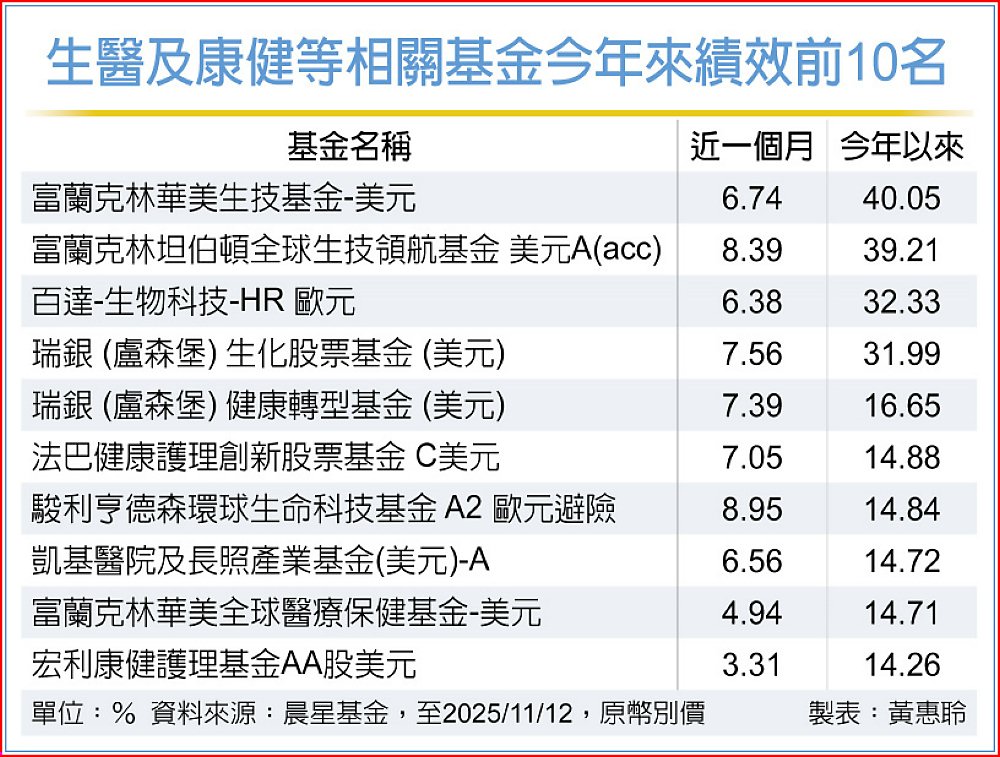 生醫股基金近月績效轉佳,主要因2025年全球醫療與生技產業獲利成長動能明確,醫療產業預估獲利成長率達11.7%,優於S&P 500指數。法人表示,第三季財報後主要次產業獲利全面上調,加上藥廠新品項推進、市占擴張及併購潮再起,醫療生技成為來年具吸引力的投資主題。