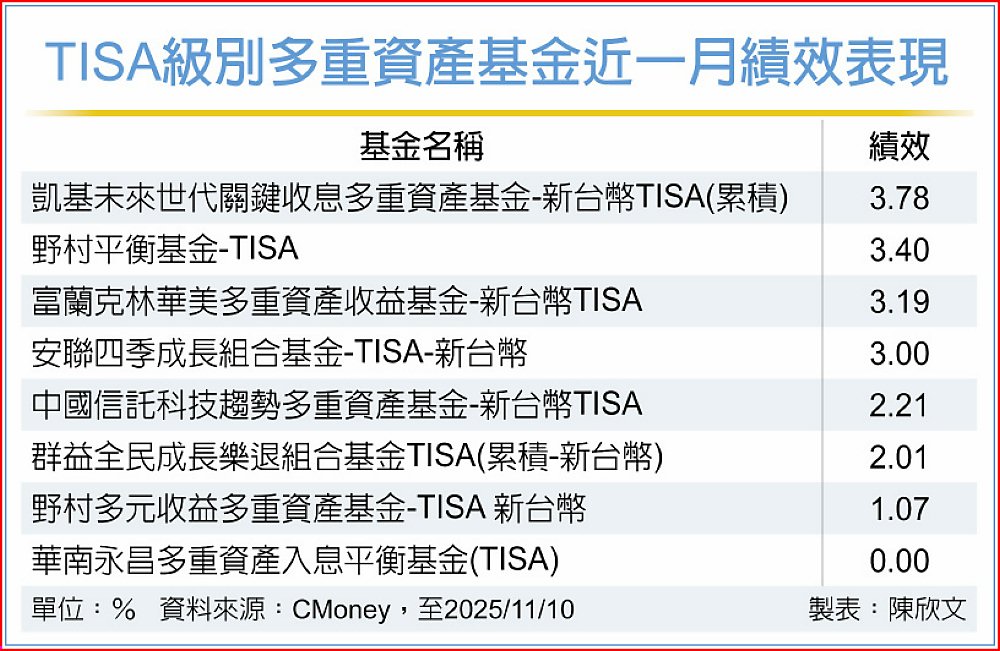 檢視TISA級別多重資產基金近一月績效,前四名都繳出3%以上總報酬,分別為凱基未來世代關鍵收息多重資產、野村平衡、富蘭克林華美多重資產收益及安聯四季成長組合,其中又以凱基未來世代關鍵收息多重資產基金表現最為突出,以3.78%拿下TISA級別多重資產基金近一月績效王。