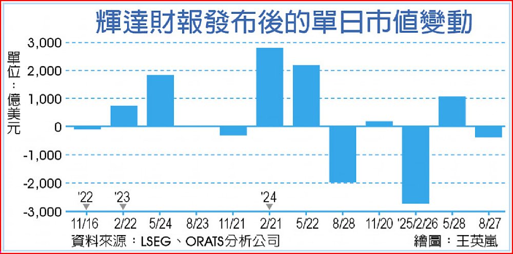 分析公司ORATS估算,就輝達期權來看,財報公布後股價可能上漲或下跌7%。若以輝達目前約4.6兆美元市值推算,市值波動可能達到3,200億美元,超越2024年2月財報後創下的2,760億美元市值跳增紀錄。