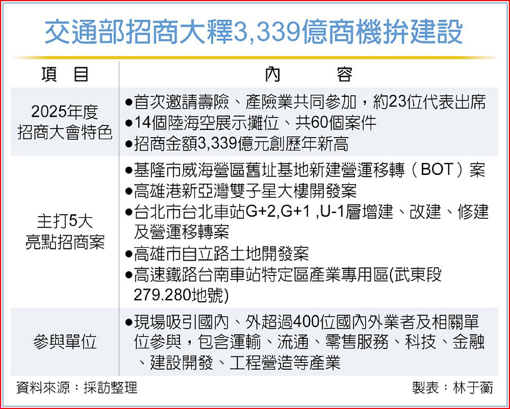 2025年度交通部招商大會,在運輸、流通、零售服務、科技、金融等多項產業釋出超過3,339億元的商機、創下歷史新高。交通部長陳世凱強調,今年是第一次正式邀請壽險、產險業共同參加,交通建設除讓民眾交通更便利、同時也是國家經濟繁榮的動力,產險和壽險的長期資金若也能投入國家發展的長期建設,可讓整個產業鏈一起壯大。