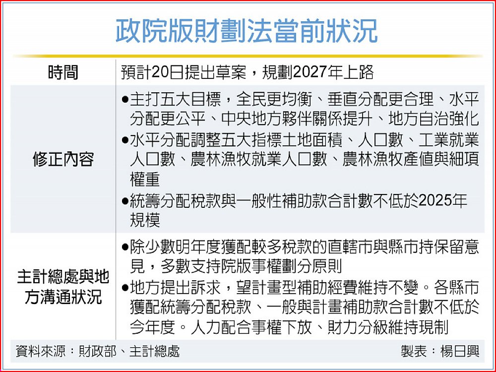 財政部國庫署長陳柏誠說,院版《財劃法》修法,聚焦全民更均衡、合理化垂直與水平分配等五大目標。如地方關注的水平分配,調整納入土地面積、人口數等五項指標與其細項權重,使整體縣市獲配財源高於直轄市。
