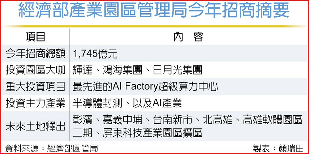 在全球供應鏈加速重組之際,台灣產業園區正成為企業高階製造與創新研發的重要據點,根據經濟部產業園區管理局統計,2025年總共促成166件投資案,總金額高達1,745億元,焦點企業包括年度投資逾350億元的日月光集團、攜手輝達建置最先進的AI Factory超級算力中心的鴻海集團等大咖。