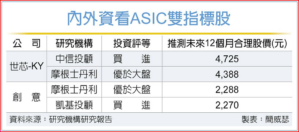特殊應用IC(ASIC)設計服務雙強—世芯-KY、創意同步獲得內外資力挺,摩根士丹利證券在世芯股價18日重挫後,迅速挺身而出護航、助股價回穩;凱基投顧則是升評創意至「買進」,調升推測合理股價至2,270元,與大摩賦予的2,288元幾乎並駕齊驅。