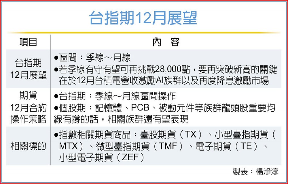 台指期19日進行結算,在外資壓低下,終場下跌199點至26,615點。法人表示,下方可觀察季線能否帶來技術面買盤,技術面來看,11月留上影線收黑K,根據過往經驗,下個月合約通常會先下再上,周四凌晨時間有輝達財報與經濟數據公布,12月開倉位置將為下個月合約走勢觀察重點。