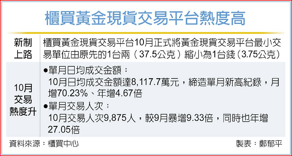 今年來市場黃金交易熱度大舉攀高,為降低投資門檻,櫃買中心10月起調整「黃金現貨交易平台」最小交易單位新制見效,黃金交易人氣爆棚,統計10月日均成交值衝上8,117.7萬元,創下單月歷史新高,交易人次更是較前月暴增逾9倍。