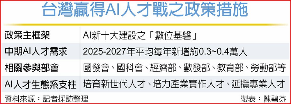 AI時代,台灣要如何贏得新人才戰?國發會主委葉俊顯表示,行政院團隊提出的「AI新十大建設」中,「數位基磐」是實現AI在各行各業落地的堅實後盾,針對AI人才,跨部會合作會透過「培育新世代人才」、「培力產業實作人才」及「延攬專業人才」三大支柱齊頭並進,建構從基礎AI素養到高階創新應用的全方位人才發展策略。