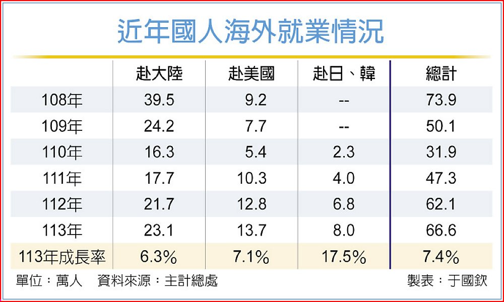 主計總處19日公布「113年海外就業統計」指出,由於哈日、哈韓年輕人赴日、韓就業續增,加以台積電海外量產人力需求成長,113年海外就業回升至66.6萬人,創近五年最高。其中以赴日、韓就業年增17.5%成長最快。