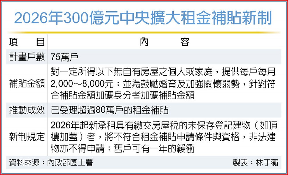 內政部國土管理署19日說明2026年300億元中央擴大租金補貼新制。為逐步提升國人居住安全,自明年起新承租具有繳交房屋稅的未保存登記建物(如頂樓加蓋)者,將不符合租金補貼申請條件與資格,非法建物亦不得申請;但舊戶可有一年的緩衝。國土署長吳欣修表示,考量這二年違規住宅申請租金補貼的案件數量增加,有居住安全疑慮,不是值得補貼鼓勵的方向。