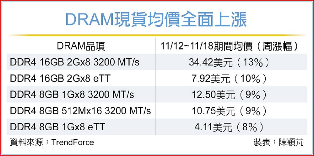 市場緊張情緒已在現貨市場率先反映。TrendForce資料顯示,截至11月18日為止一周內DRAM現貨均價全面上漲,光是DDR4 16GB 2Gx8 3200 MT/s均價就較前一周上漲13%至34.42美元。