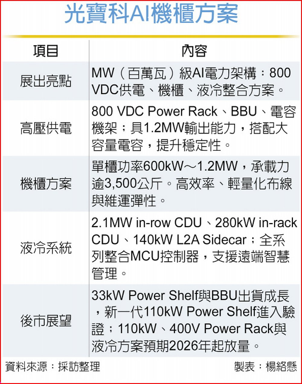 在機櫃端,光寶科針對AI資料中心的高密度部署推出MW級承載架構,單櫃功率可達600kW~1.2MW,並具備超過3,500公斤承載力,以高效率與輕量化布線提升維運彈性。隨著雲端客戶擴大GPU集群規模,供電、熱管理與結構承載的協調性成為關鍵設計考量。