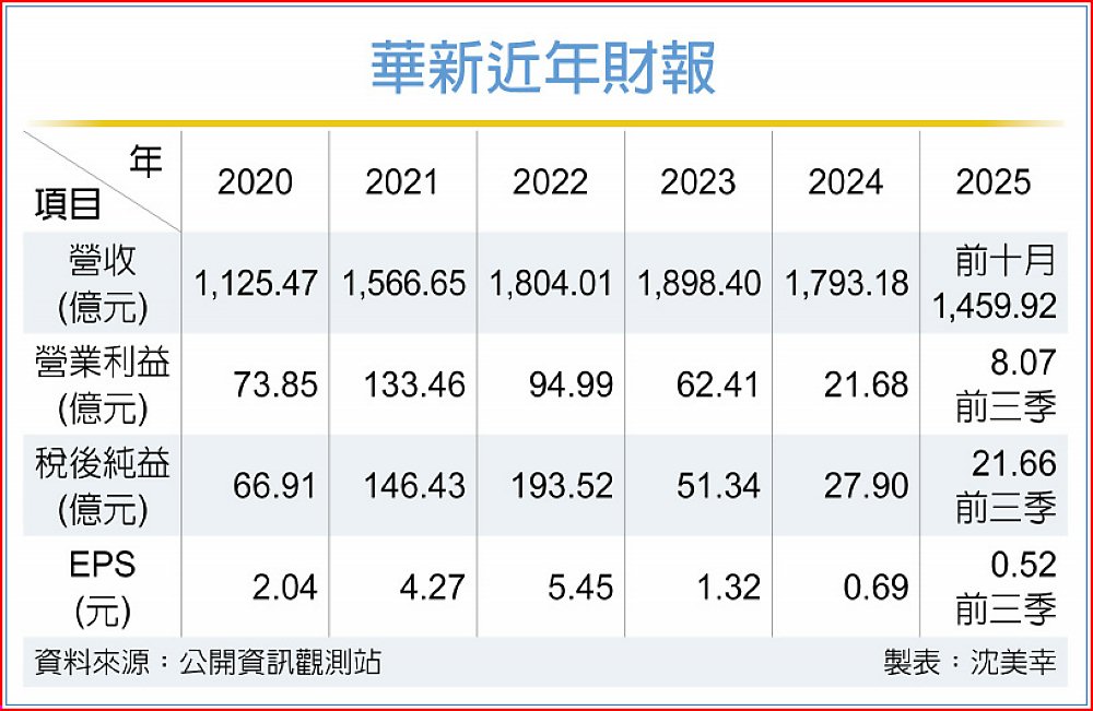 華新第三季本業虧損6.4億元,靠著轉投資華新科、華邦電、東元等公司獲利、股票股價上漲等近12億元業外收益挹注,第三季每股稅後純益(EPS)從去年同期0.09元大增至0.23元、前三季EPS為0.52元。