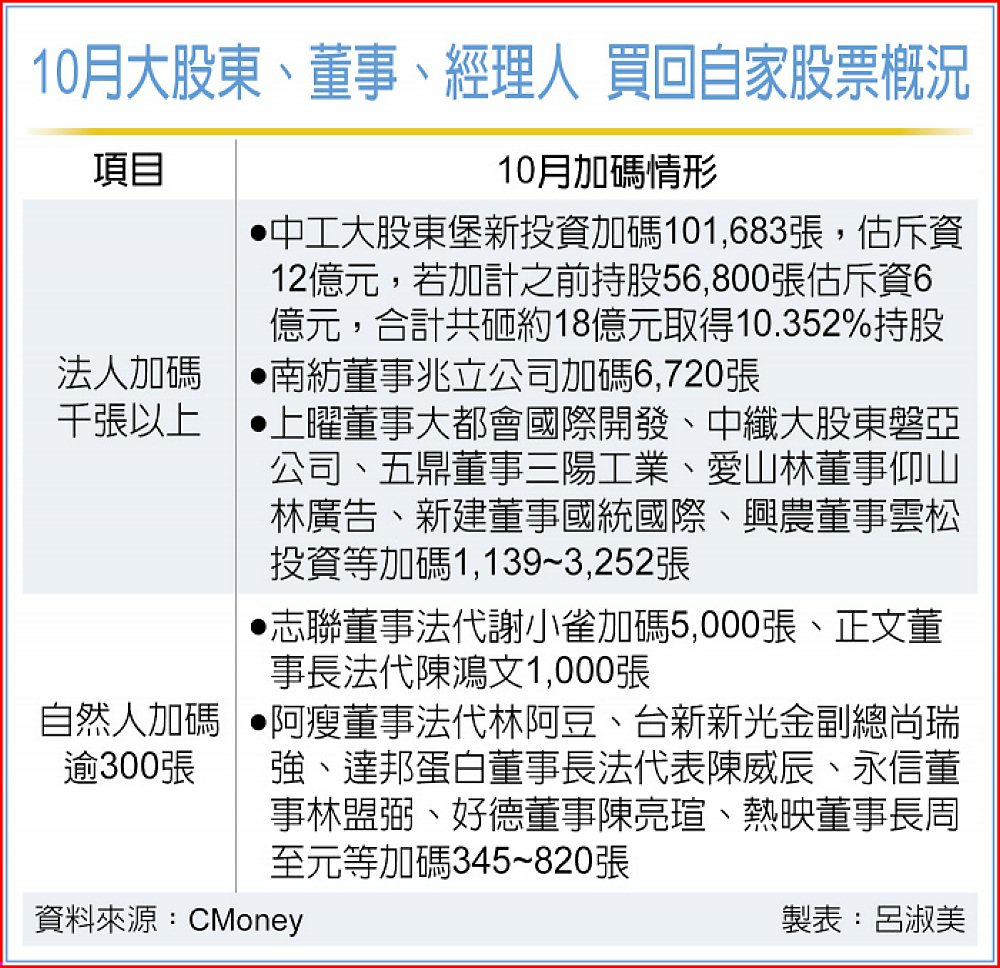 傳產股跌不休,大股東、董事等10月紛紛買股救「價」,最受關注是寶佳集團10月約斥資12億元大敲中工(2515)超過10萬張,再加上11月來進場的資料顯示,已成功插旗中工;另南紡(1440)董事兆立公司也加碼6,720張、志聯(2024)董事法人代表人謝小雀自掏腰包加碼5,000張。