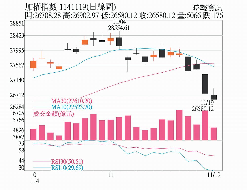 在台股方面,近期加權指數出現前一日回檔修正,但隔日買盤卻無法迅速收復失土的情形,為本波上漲以來較為罕見之情形,也應證在降息機率不斷走低的情況下,指數上漲力道將暫受壓抑,然觀察台股下方季線持續墊高,中多格局並未遭破壞。至於短線上可留意台股能否以10月13日長下影線低點作為防守點,在26,500點附近構築支撐,透過橫盤整理的方式,以盤整消化利空,待國際不確定性消逝後,台股仍有望再次向上發起挑戰。