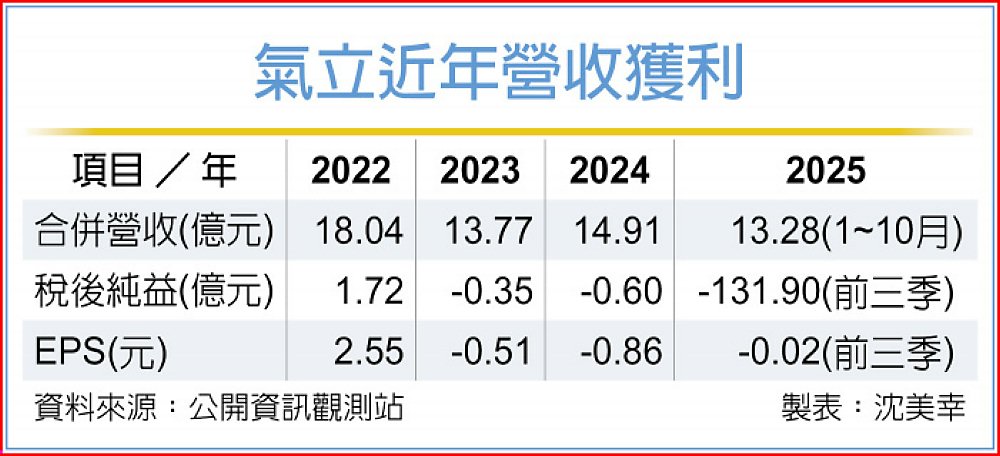 氣動元件廠氣立(4555)布局半導體及人形機器人產業逐漸發酵,第三季轉虧為盈,氣立估11、12月出貨可維持10月水準,今年營收有望成長,衝全年獲利。超音波流量感測器已送樣給多家半導體及散熱產業客戶驗證,最快明年第一季出貨,期盼明年營收及獲利均成長。