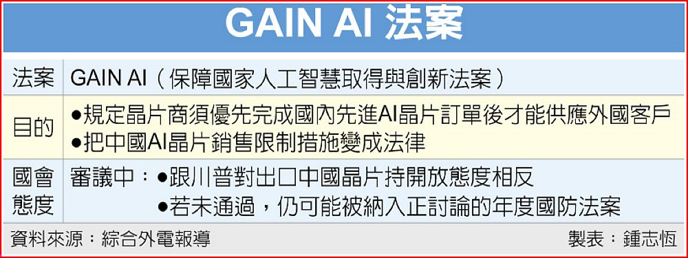 共和與民主兩黨曾在國會聯手提出GAIN AI法案,要求晶片商須先滿足國內先進AI晶片訂單後,才能供應中國等外國客戶。外界認為,該法案還有一目的,就是要把對中國AI晶片銷售限制行政措施變成法律。但川普先前已暗示,對於向中國出口AI晶片抱持開放態度,因此白宮希望說服共和黨人能否絕這項法案。不過該法案提案人之一也就是共和黨籍參議員班克斯對於該報導則未有回應。