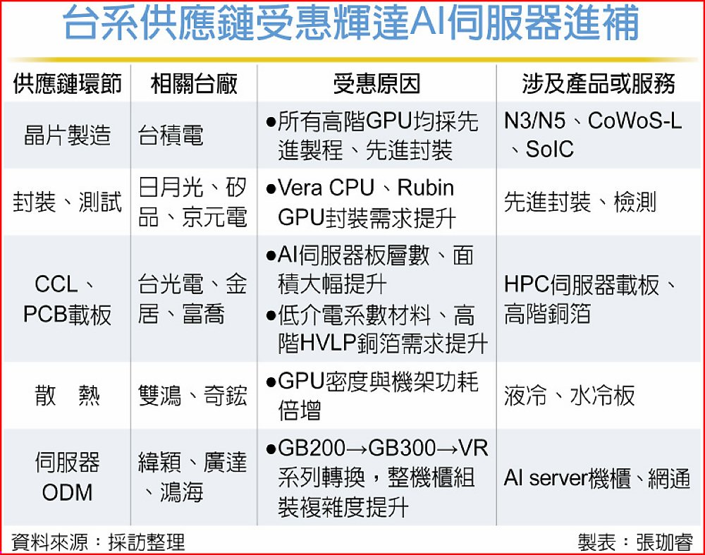 台系OSAT與AI伺服器ODM業者,也將跟著輝達成長,享有能見度拉長、產品升級等紅利,緯穎、廣達、鴻海訂單能見度延伸至2026年以後。