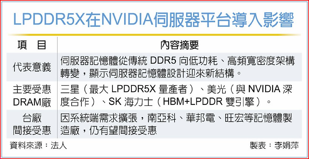NVIDIA新一代AI伺服器平台傳出,將更大規模採用LPDDR5X,低功耗DRAM有望從手機跨入高階伺服器領域,三大DRAM原廠包括三星、SK海力士及美光,預期將因此受惠。