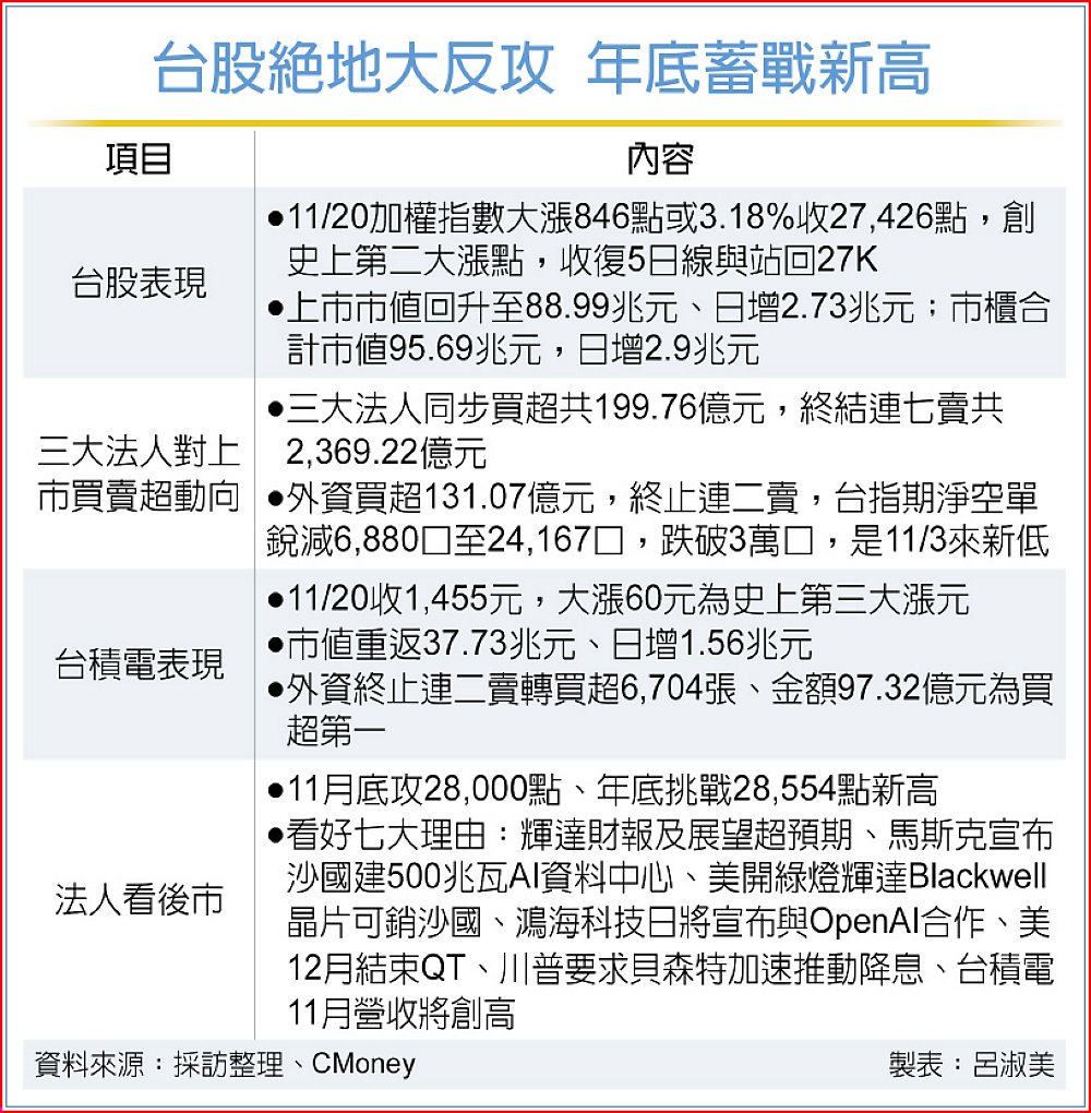 輝達財報及展望超預期及黃仁勳駁AI泡沫說,激勵外資20日期現貨同步作多,斥資97.32億元回補台積電,神山股價如猛虎出柙收1,455元、勁揚60元,率軍強攻反彈,推升加權指數大漲846點或3.18%收27,426點,量增至5,923億元,寫下史上第二大單日漲點,並一舉收復5日線與27,000點關卡。