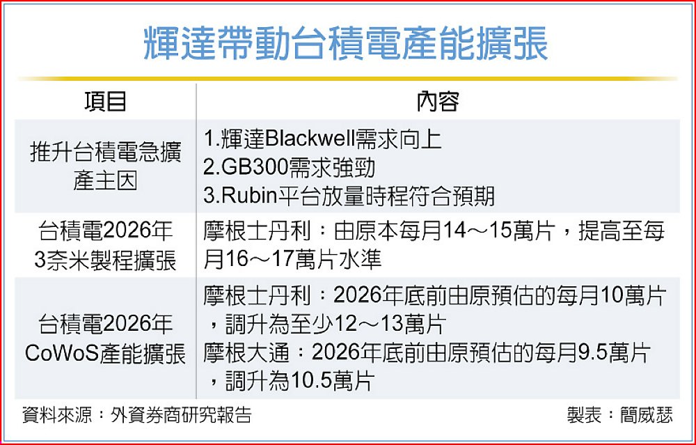 不僅如此,外資最新調查也預料CoWoS產能將調升。繼摩根大通證券估計,台積電2026年底前CoWoS每月產能上看10.5萬片後,摩根士丹利最新預測,台積電2026年底前會將CoWoS產能提高2成,屆時CoWoS每月產能會從大摩原本估計的10萬片,變成至少12~13萬片。