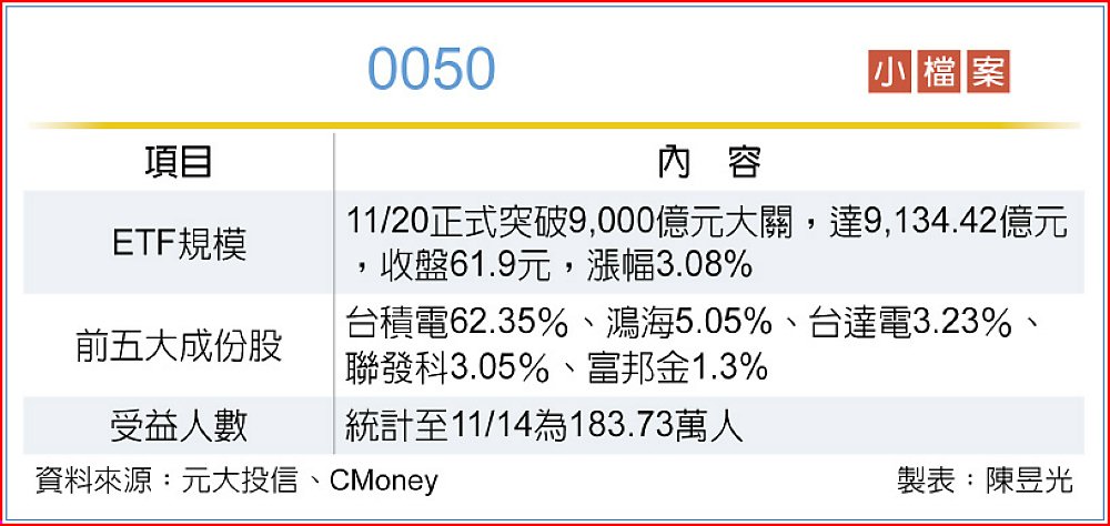 據統計,0050自第四季以來至11月19日淨申購達1,245億元,且近一周大盤修正,更密集獲得淨申購256億元,隨20日台股上漲,帶動規模創9,134.42億元新高,等於在10月15日創下8,000億元紀錄後,僅相隔25個交易日,規模再突破9,000億元新高。