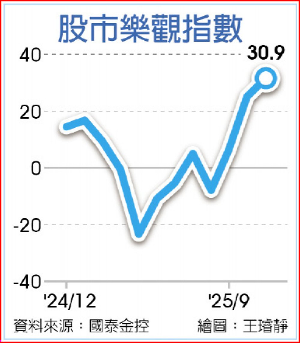 根據國泰金控最新調查結果,美國聯準會(Fed)連續降息,提振投資人情緒,加上主要市場財報表現亮眼,國際股市,以及台灣股市震盪走高,民眾對於台股的樂觀指數與風險偏好指數,雙雙飆高,分別走升至30.9與20,分別創下近15年、近一年半新高。
