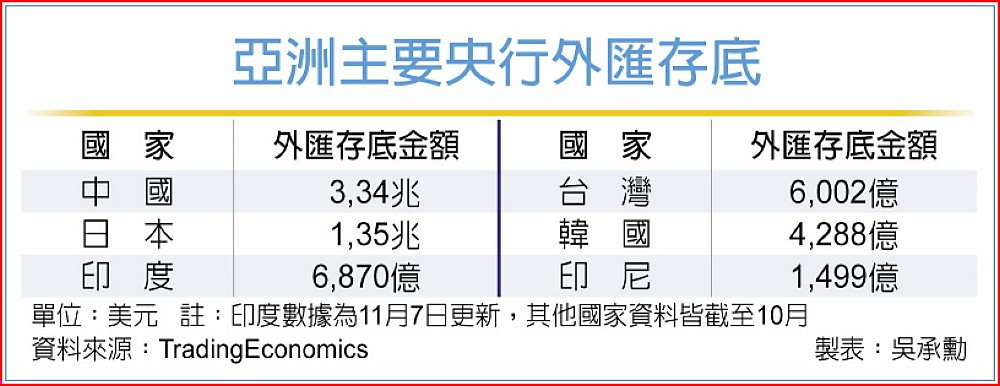 隨著美元不斷走強,亞洲各國紛紛面臨本國貨幣貶值的壓力。然而根據外媒彙整亞洲前11大主要央行外匯存底,估算目前總額已激增至近8兆美元,這也讓各國央行如日本、韓國以及印度等在必要時刻,有相當充足「彈藥」來捍衛匯市。