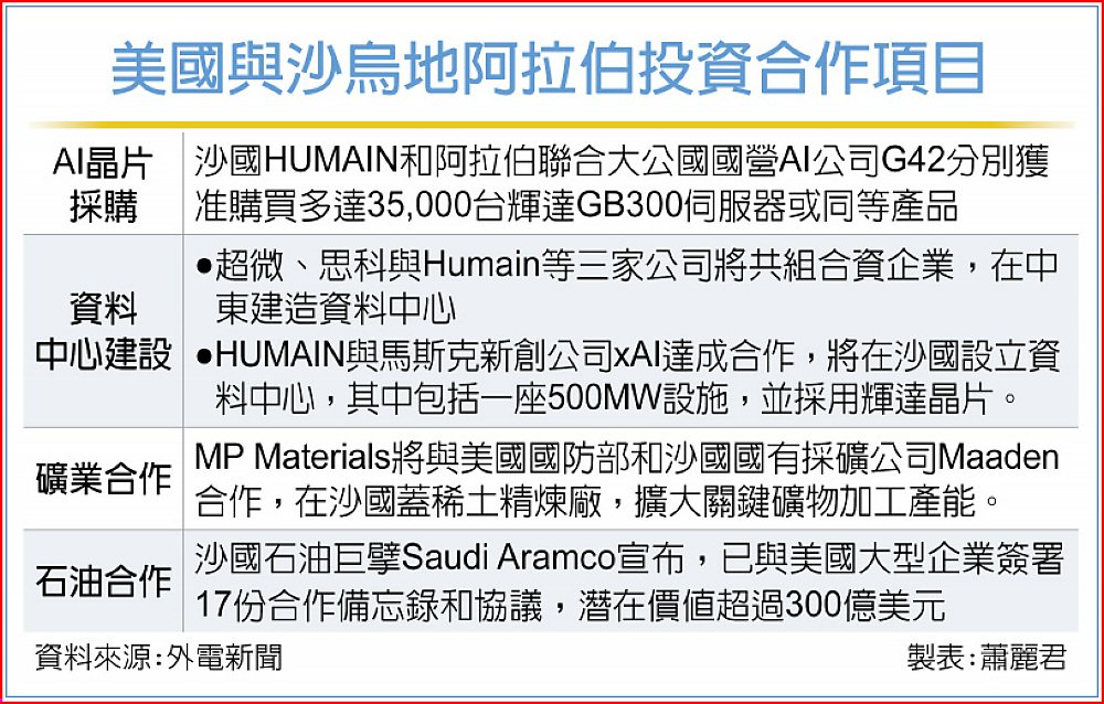 沙烏地阿拉伯王儲薩爾曼走訪美國,與美總統川普談及多項投資與合作,美政府大開綠燈,允許輝達(NVIDIA)向中東兩國銷售7萬顆AI晶片,此外沙國人工智慧(AI)公司HUMAIN也將與商業鉅子馬斯克旗下的xAI聯手建造資料中心。