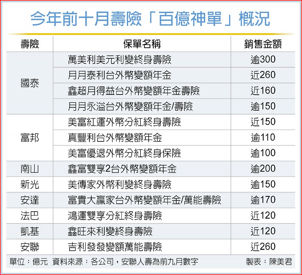 外商壽險安聯人壽的熱賣保單「吉利發發變額萬能壽險」,今年前九月銷售金額逼近260億元;南山人壽「鑫富雙享2台外幣變額年金」,前十月熱賣逾200億元;新光人壽「美傳家外幣利變終身壽險」則賣出超過150億元。