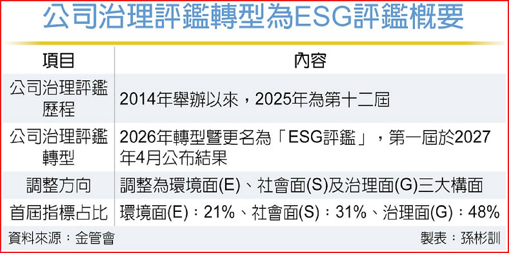 金管會證期局主任秘書黃仲豪20日宣布,公司治理評鑑將於明年轉型暨更名為「ESG評鑑」,第一屆ESG評鑑將於2027年4月公布結果。