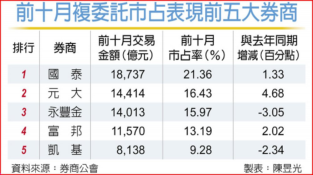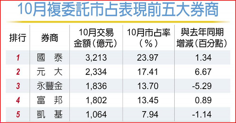 在券商複委託市占表現上,國泰證券仍穩居市場龍頭,市占率仍超過2成以上,達23.97%;前十月交易金額達1.87兆元,市占率21.36%,較去年同期增加1.33個百分點。
