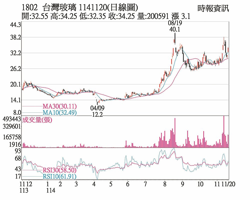 台玻(1802)受惠第三季毛利率、營益均大幅成長,明年產能看增下,大受法人青睞買進,20日開高收漲停34.25元,成交量衝破19.94萬張,其中外資大量換手,合計單日買超8,591張,在需求持續旺盛下,後續有望挑戰年線高點40元大關。
