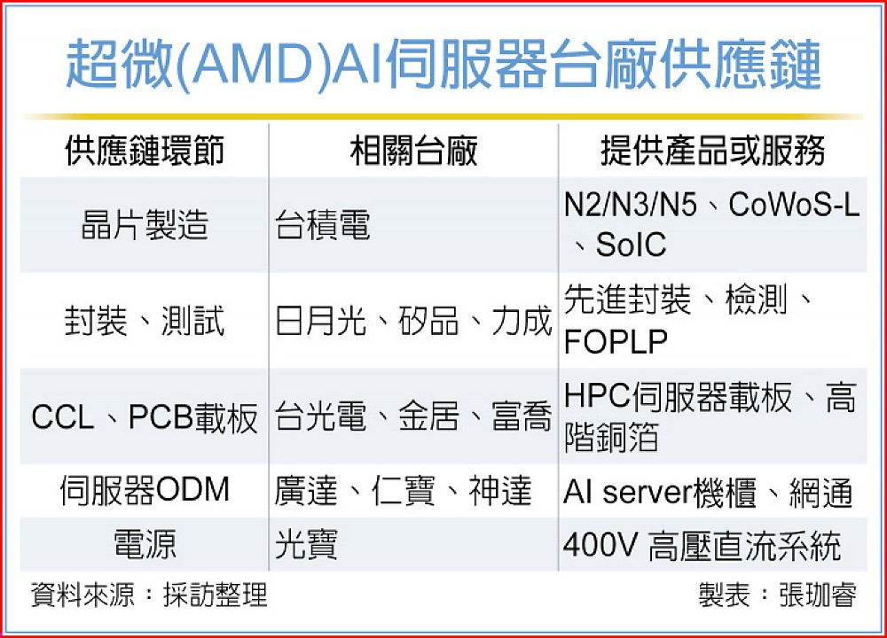 AMD多點發展,資料中心強勁成長、消費性產品第三季也寫單季新高紀錄,嵌入式(Embedded)領域新產品開始向主要客戶出貨,如Versal Prime系列,適用機器人、智慧工廠等。從晶片製造、先進封裝到整機櫃台廠扮演重要角色,助力AMD站穩AI領導地位、為其未來3~5年提供強勁成長動能。